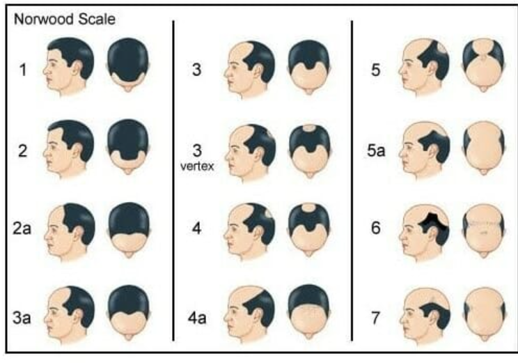 The Norwood Scale (also called the Hamilton-Norwood Scale) is a standardized classification system used to describe the different stages of male pattern baldness (androgenetic alopecia).